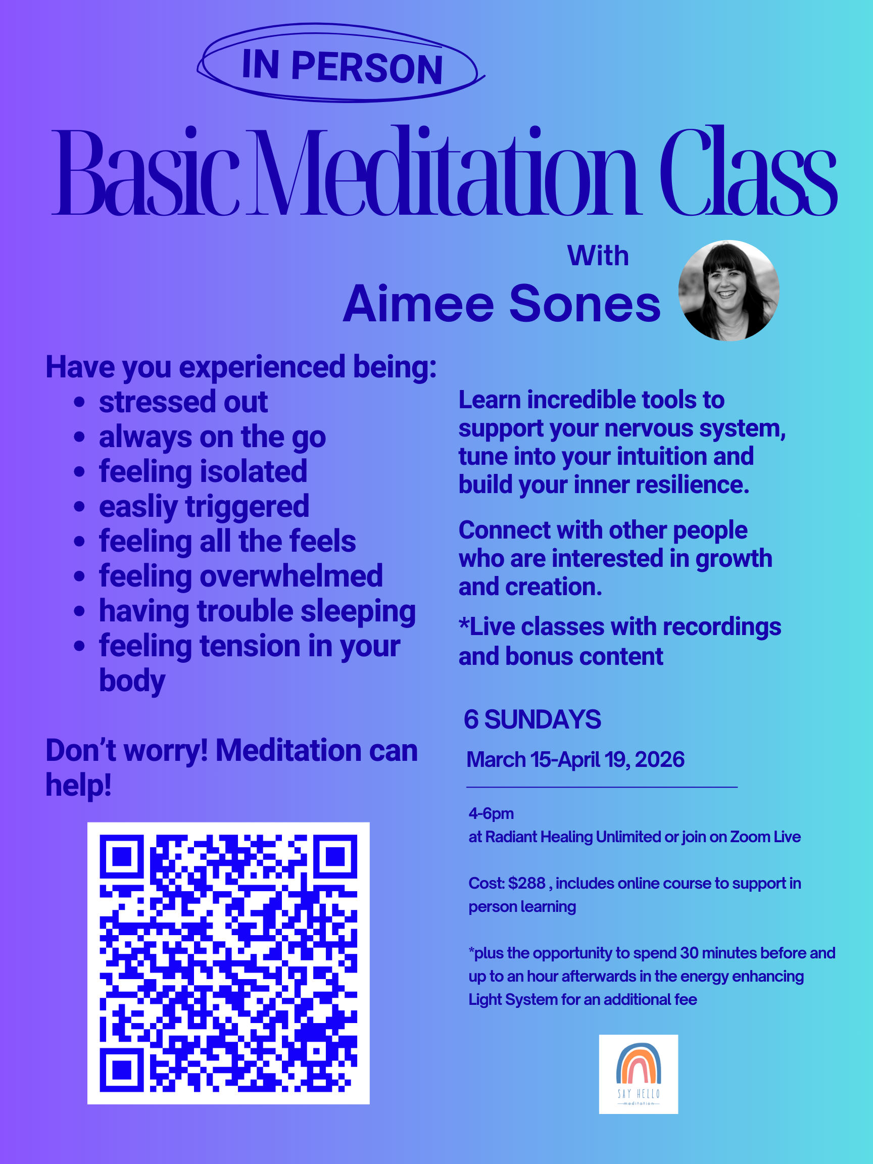 Email Aimee with any questions, hello@sayhellomeditation.com